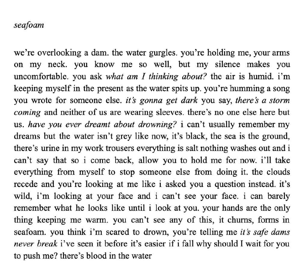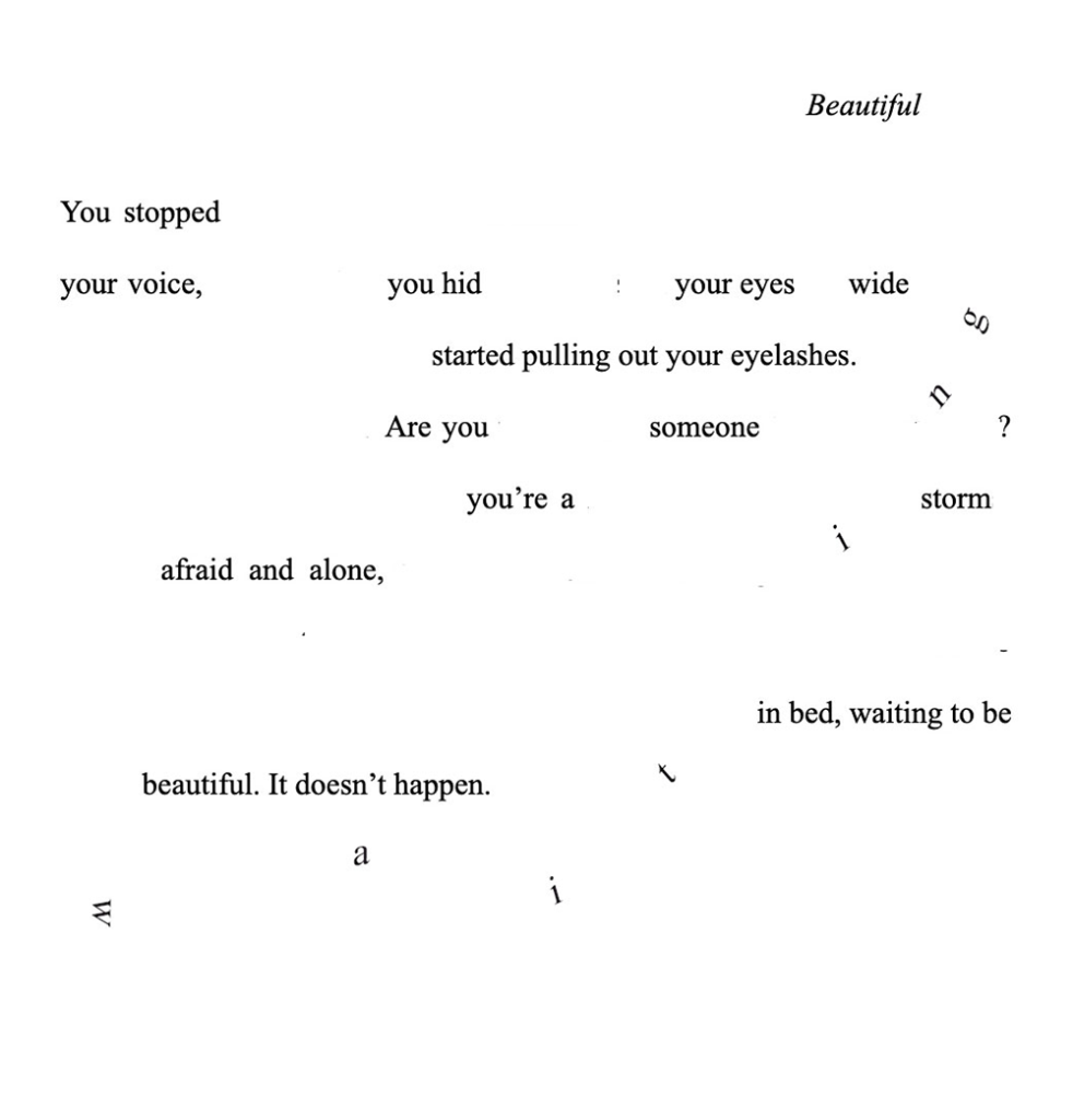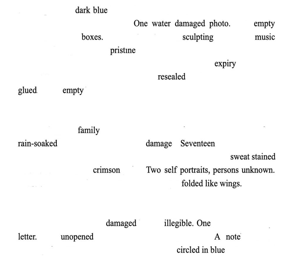 During the Writing the Archive, I was thinking about memory and personal archives. I looked at linoprinted art books and how an image alongside text can tell its own story. I thought about how erasure can add to, or even sometimes create, meaning. In each poem I look at a different way memory can change; from the climate, to mental health, to situationships, to uncertainty. For the image based panels I used words to distort and create meaning and played with colour.