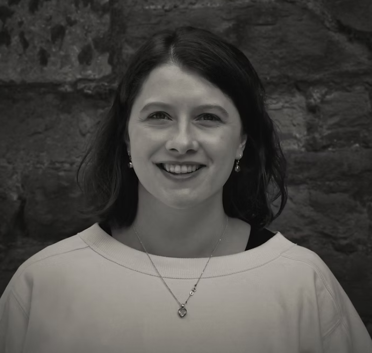 A greyscale photo of Lydia Marchant, a white woman with long blonde hair, wearing a striped jumper under a grey coat. She stands with her hands behind her back and smiles at the camera.
